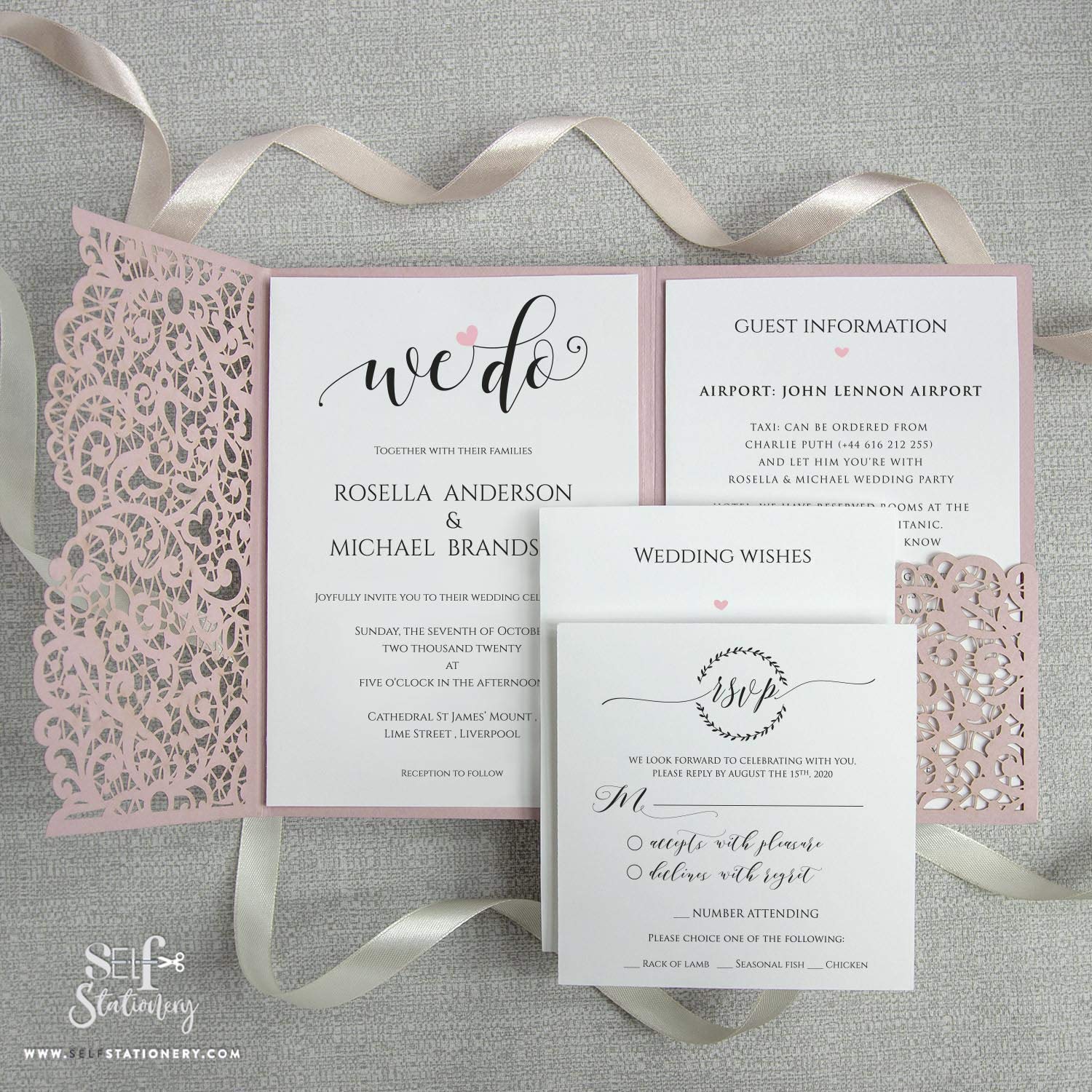 Diy Set Laser Cut Misty Rose Blush Wedding Invitations With Envelopes Pocket We Heart Do Day Invite Evening Invite Guest Information Rsvp Amazon Co Uk Handmade Products